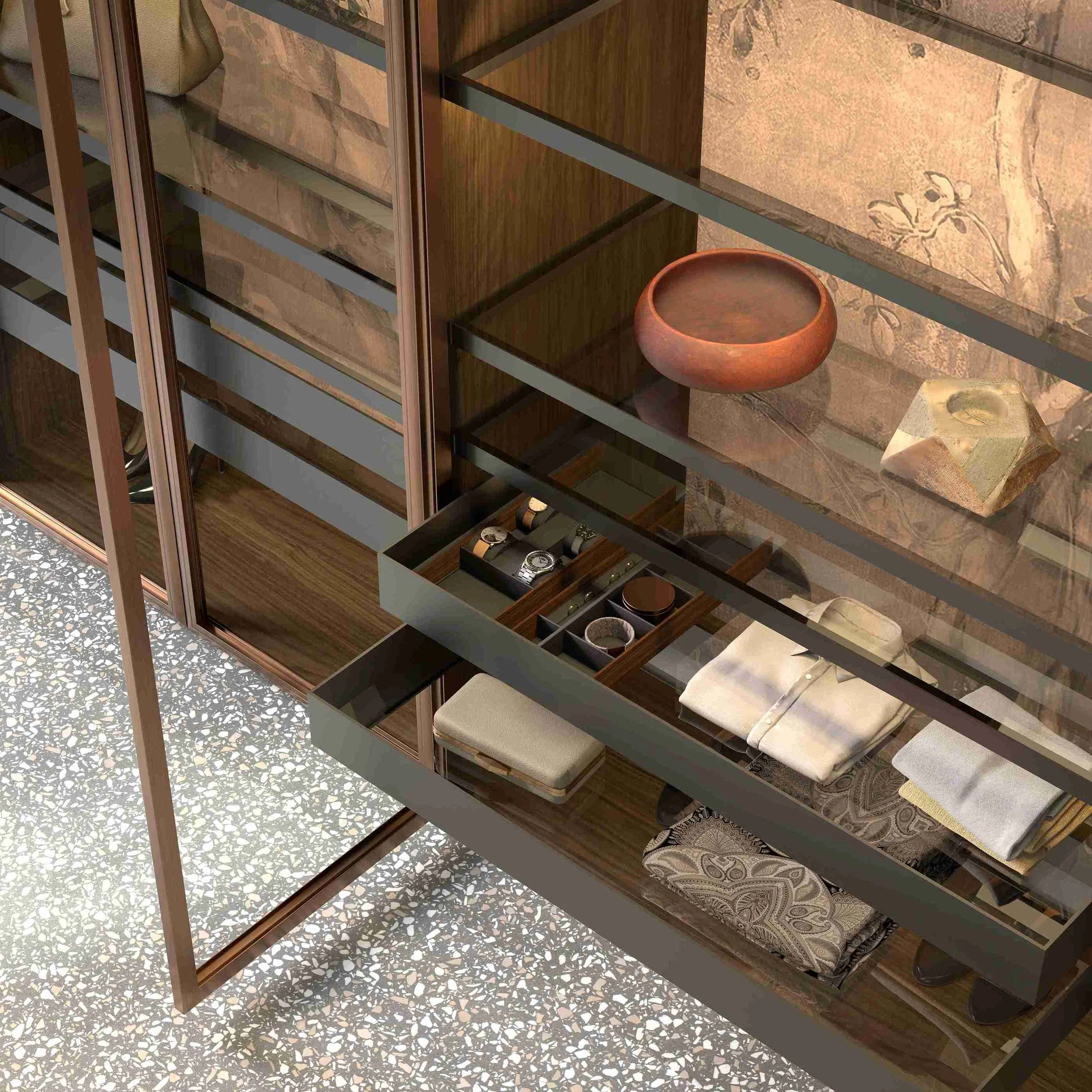Soft hinged door with satin Copper painted aluminium frame, in the reflective Bronze tinted glass version and the acid-etched back-lacquered glass version.