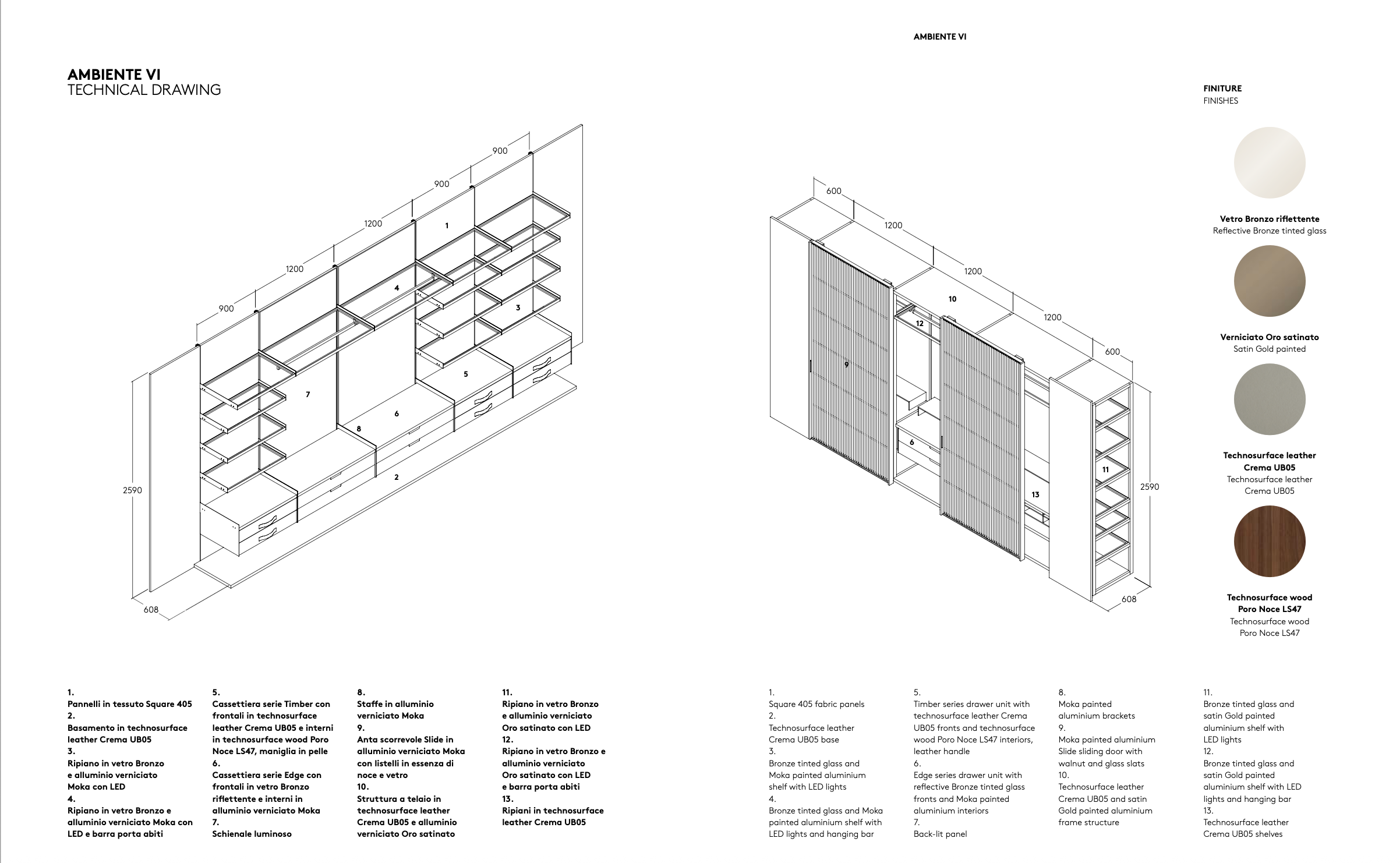 Moka painted aluminium Slide sliding door with walnut slats. Internal structure with frame sides in satin Gold painted aluminium, technosurface leather Crema UB05 bases and tops.