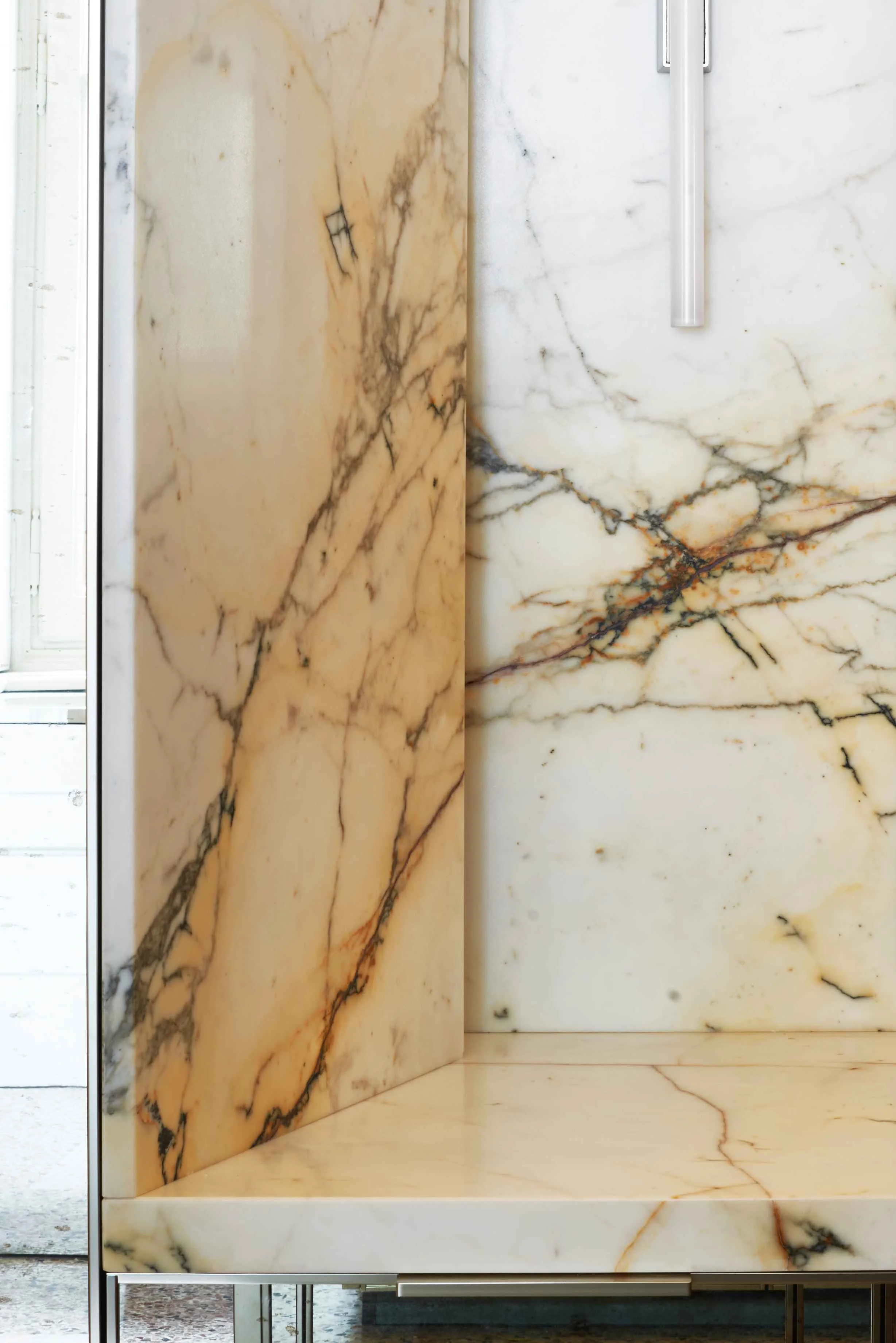 The reflective surfaces create a gentle interplay of light and space, enhancing the sense of openness. Contrasting materials on the sides, countertop, and backsplash offer a sophisticated balance of texture and tone, elevating the entire room with a subtle, luminous elegance.