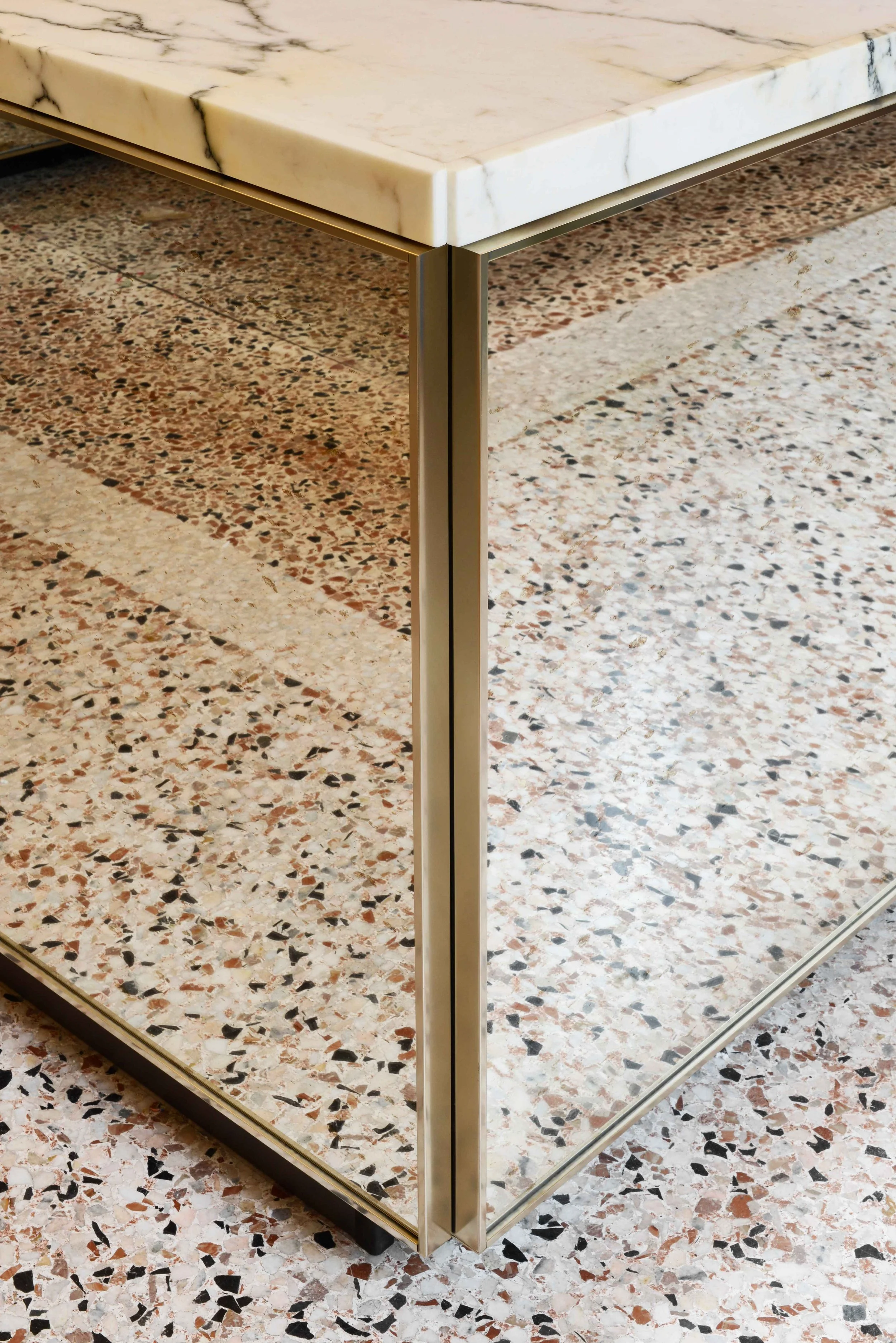 The Atrium collection channels the essence of home through a refined neoclassical lens. Featuring antique mirrored doors framed in SCIC Silver—a soft, warm-toned aluminum finish reminiscent of aged silver—Atrium brings light and livability to the kitchen.