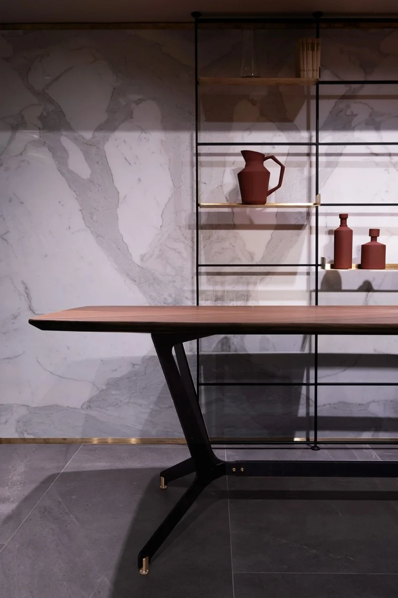 The soft form of table creates a vivid contrast with the marble top in strong and decisive tones. The rounded form coupled with mixed and decisive colors is supplemented by an iron leg with basement in brass. A shapes and materials union which perfectly converse among each other to realize a sculpture table.