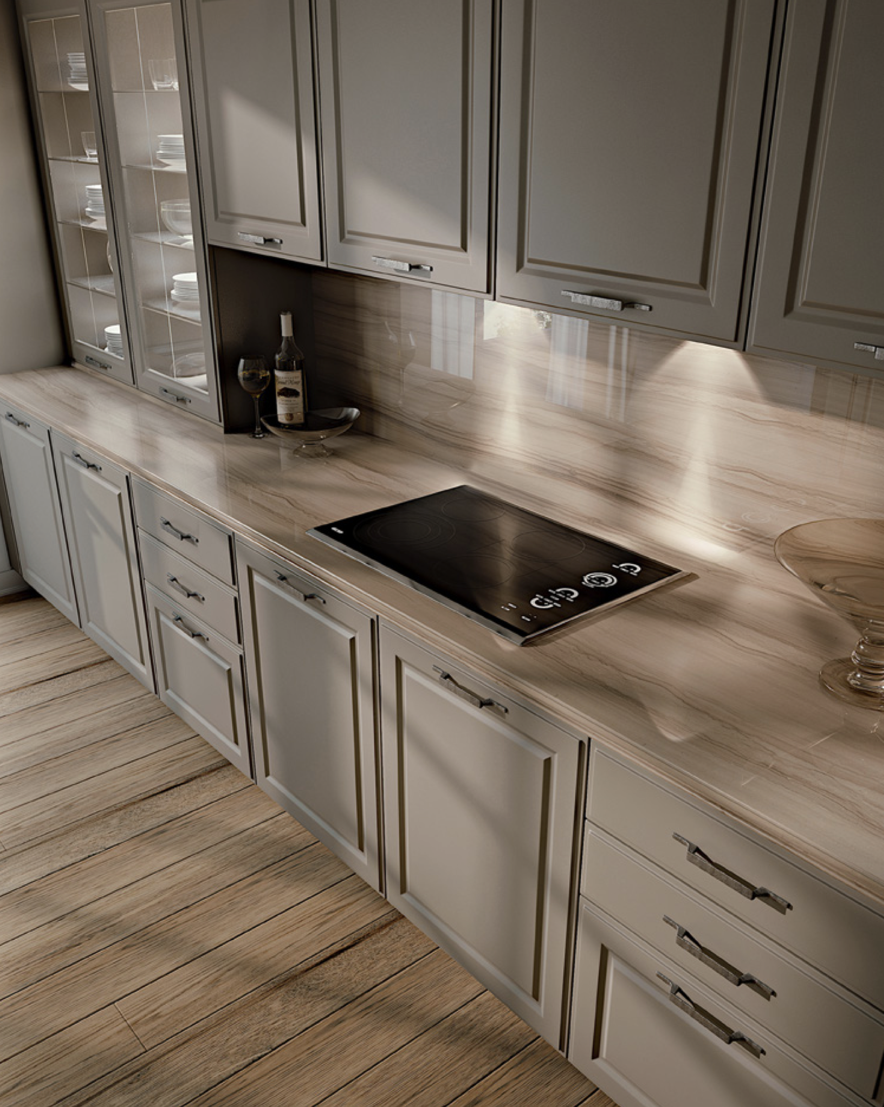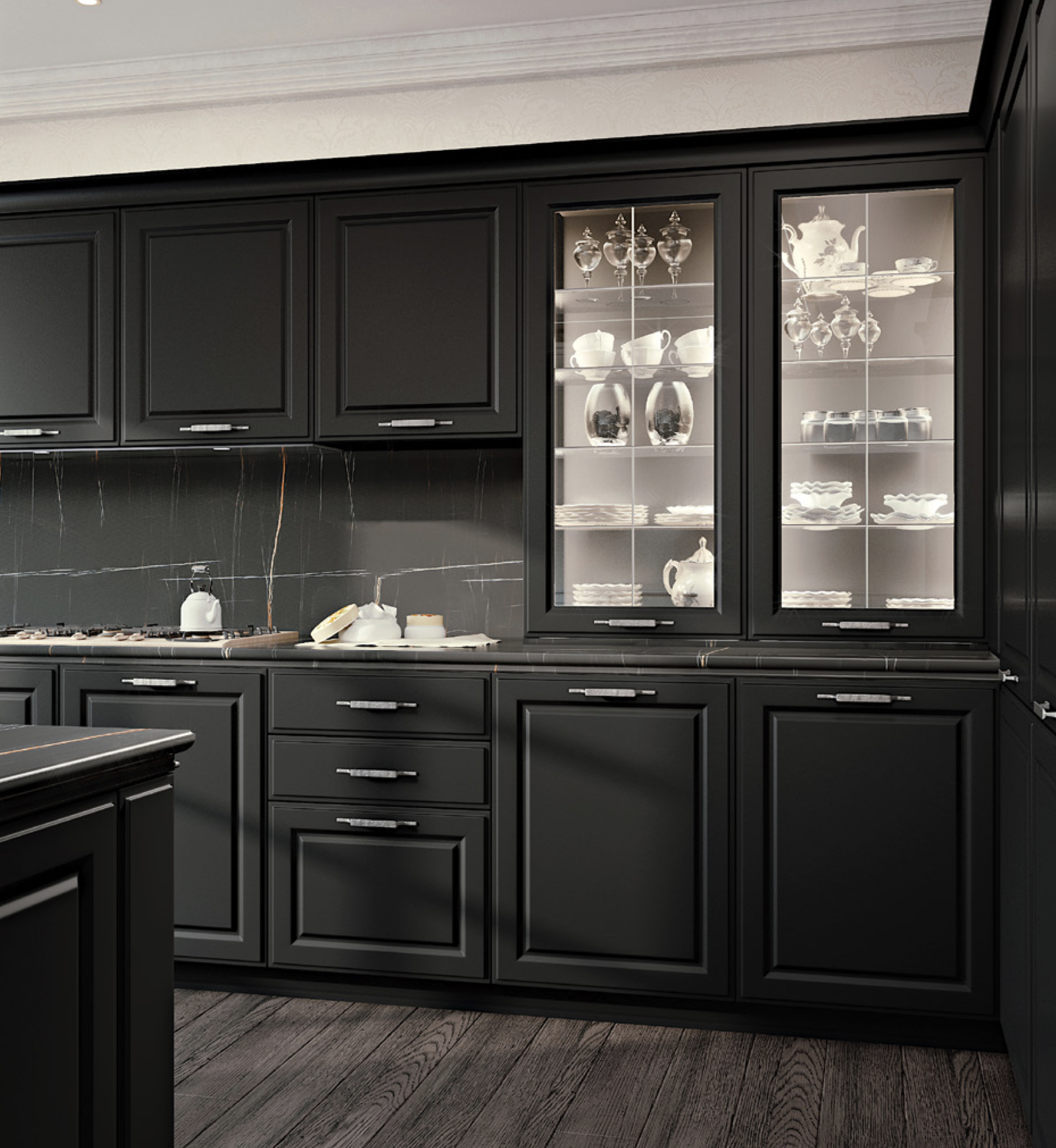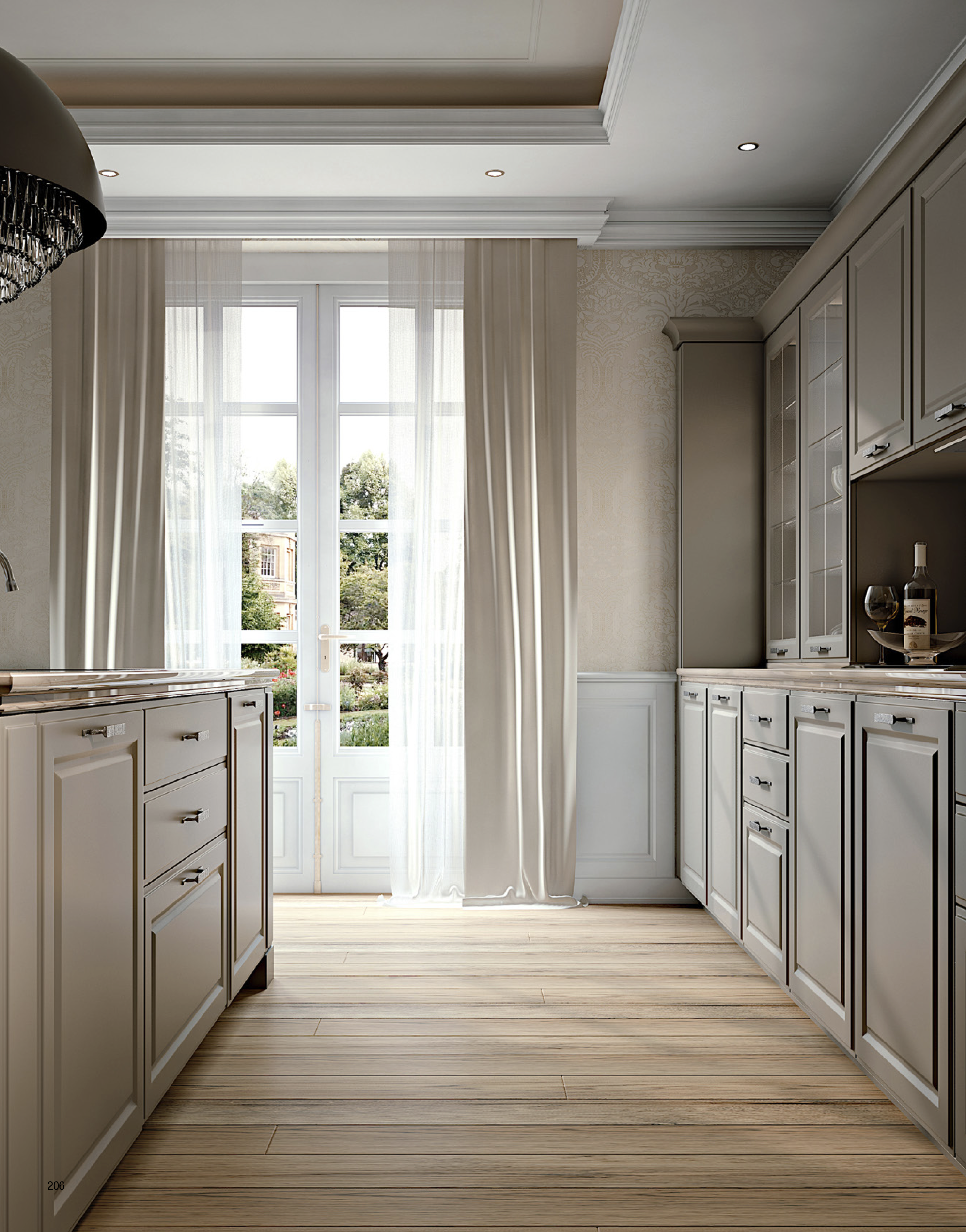 A solution designed for those who love a warm, enveloping style with definite British references. A kitchen endowed with plenty of modularity and many characterizing elements, which can be further customised by matching lacquer finishes with different materials for countertops and backsplashes.