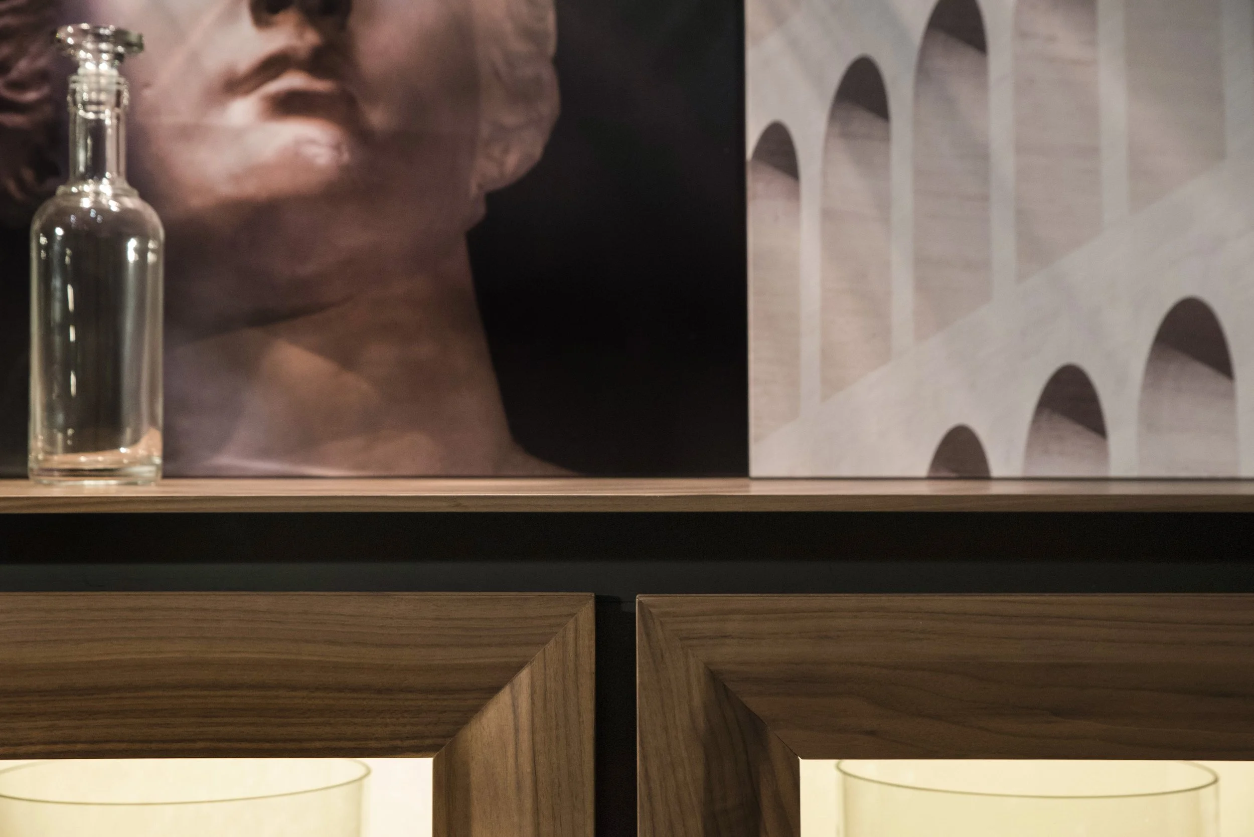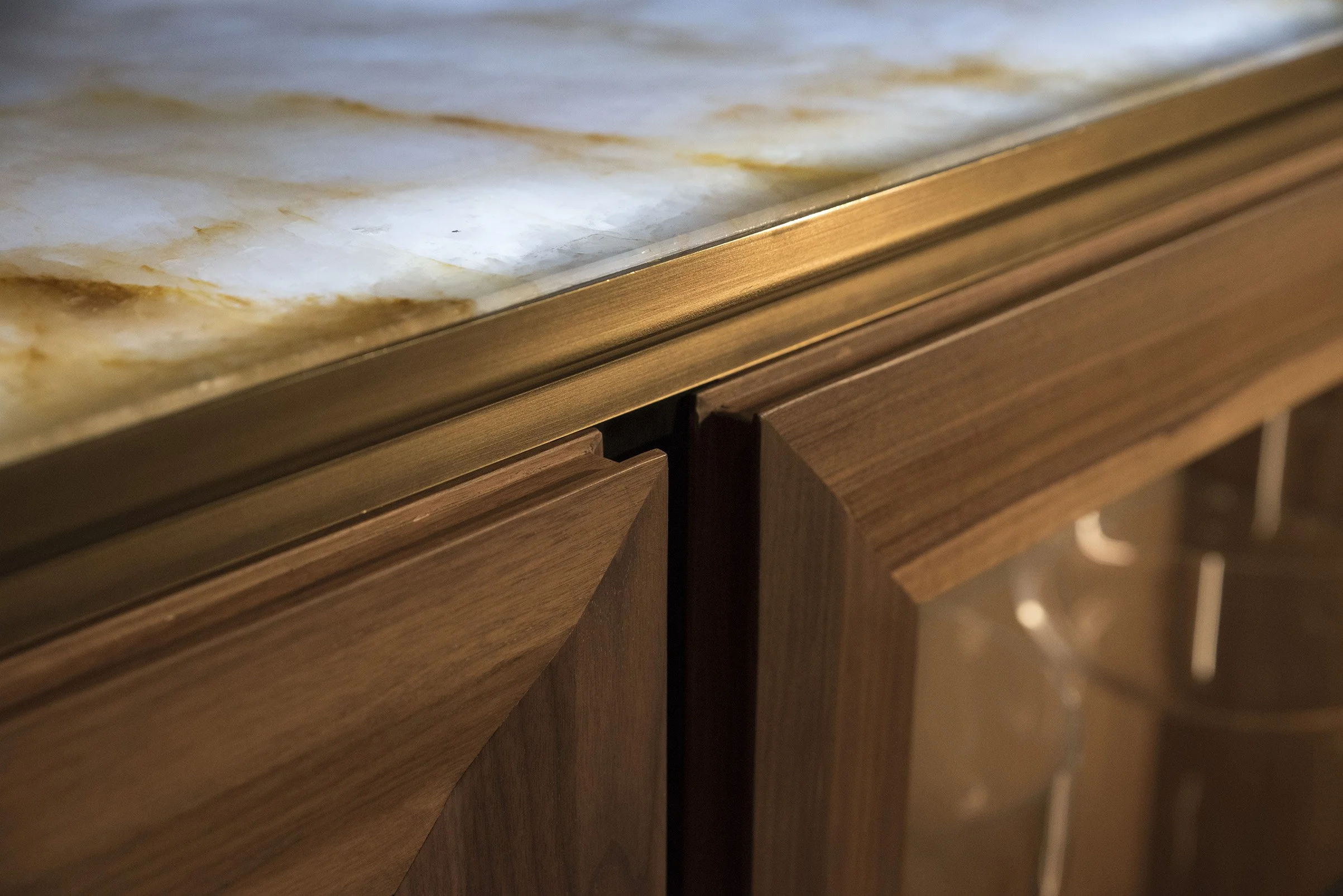 Just like a pathway that forks into different branches, the Labirinto project goes through diverse solutions and finishes to achieve a single result of beauty and harmony. Just like a hedge maze or a sixteenth-century star-shaped city, we sought to enrich the Labirinto project with tactile and visual sensations that ultimately make up its real peculiarity. The black aluminium frame, with its peculiar outline, supports a natural metal panel available in antique brass or steel, with many fascinating finishes such as vintage, satin, copper, slate and lacquered.
