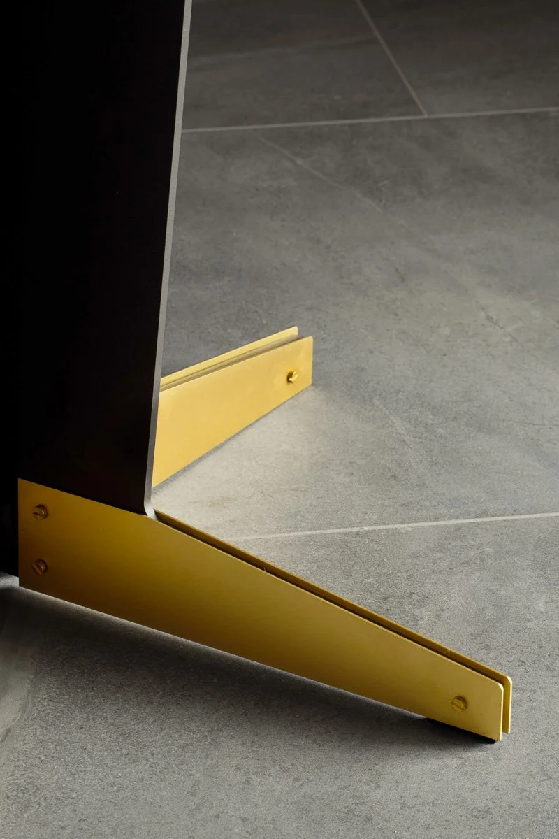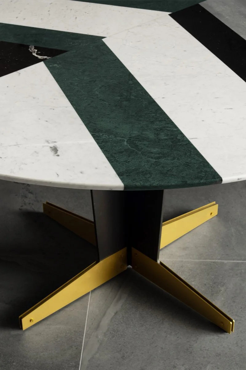 The soft form of table creates a vivid contrast with the marble top in strong and decisive tones. The rounded form coupled with mixed and decisive colors is supplemented by an iron leg with basement in brass. A shapes and materials union which perfectly converse among each other to realize a sculpture table.